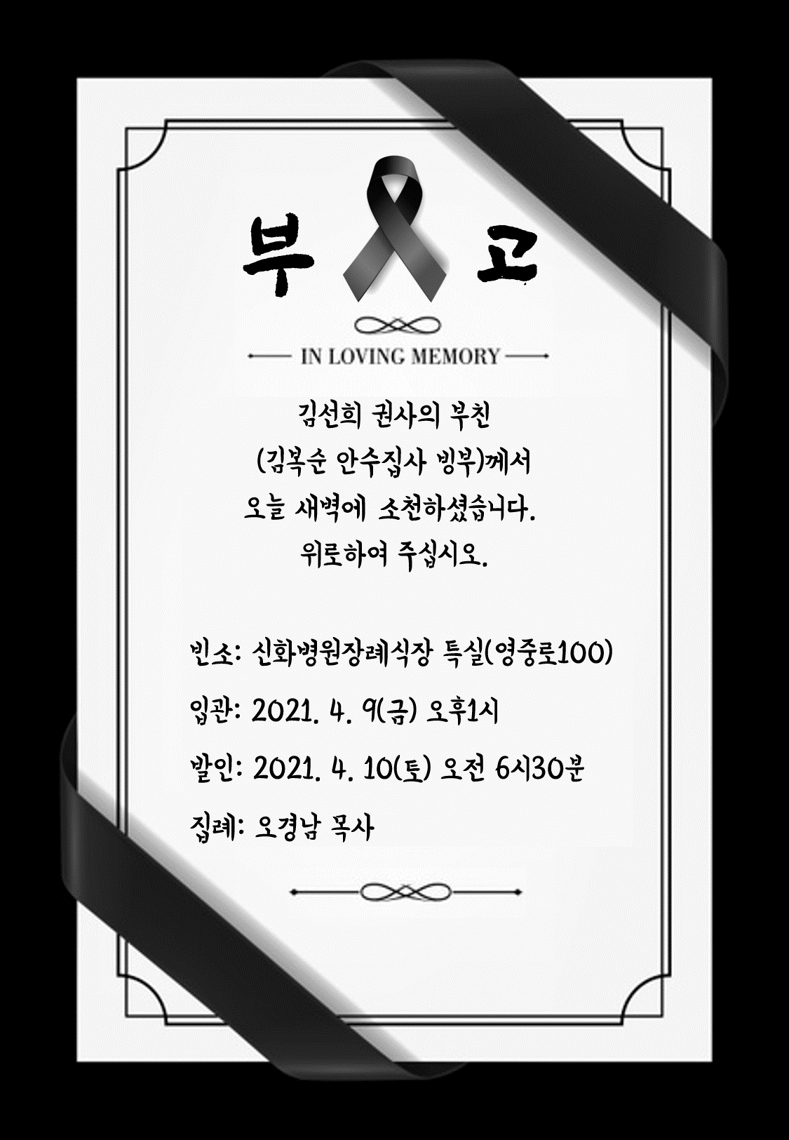 [부고] 김선희 권사 부친 (김복순 안수집사 빙부)